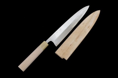 堺一文字光秀 薄刃包丁 霞 八寸 本鍛錬 青鋼 青波打 朴柄 箱付 名入