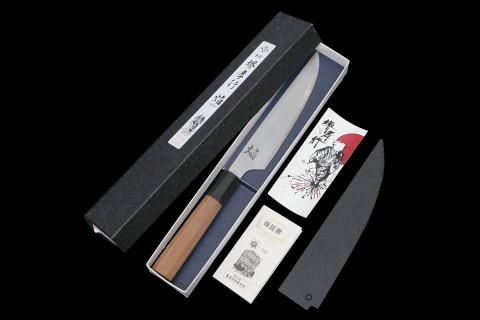 堺一文字光秀出刃包丁 七寸 青鋼 墨流し 黒檀柄 白鞘付・箱付 名入 KN02-B3782-2L4