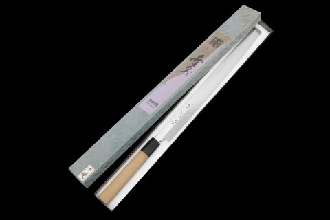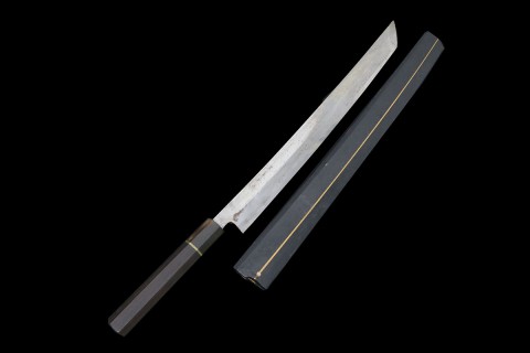 無銘 剣型柳刃包丁 九寸 銀三墨流し 銀線巻黒檀柄 鞘付